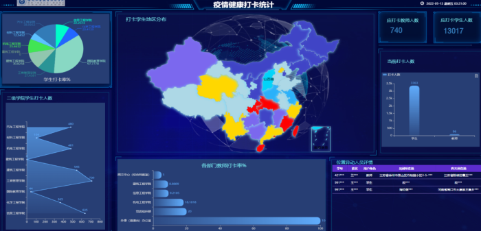 学校通过智慧校园平台综合运用大数据手段推进学校治理模式变革,生成学校、教师和学生三个层面的动态实时数据画像,对学校教、科、研、管、资、服六个方面工作成效和教师与学生群体发展状况进行全面实时的展现。目前,学校41个专业、754名教师、13516名学生、1000余门课程的状态数据能够进行实时汇总核查。进一步提高学校决策的科学性和可靠性,为规划学校的未来发展提供了最直接、最充分的依据,有效支撑学校高质量发展。