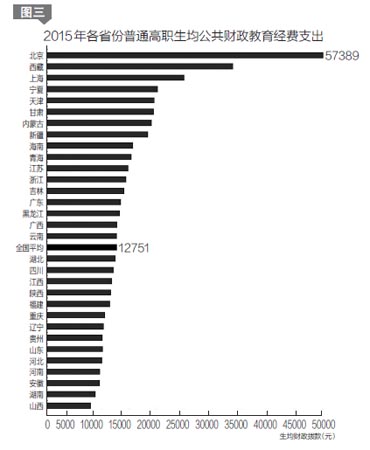生均公共财政教育经费支出地区差异也较大。全国19个省份生均公共财政教育经费支出超过12000元,北京、西藏、上海、宁夏等4个省份生均公共财政教育经费较高,已经超过2万元。12个省份生均公共财政教育经费支出不足12000元,山西、湖南、安徽、河南等4个省份低于10000元,仍需增加公共财政教育经费投入(见图三)。尤其需要指出的是,除北京、西藏以外,29个省份都有公办高职院校年生均财政拨款水平低于9000元,应引起高度重视。