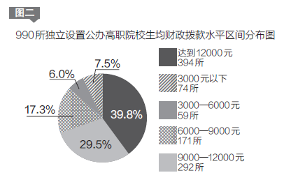 报告显示,在经费保证方面,高职院校生均财政拨款水平差异很大。全国990所独立设置的公办高职院校,生均拨款低于12000元的院校超过60%,甚至还有133所院校低于6000元,主要为地级市举办的高职院校;74所院校低于3000元,主要为行业企业举办的高职院校(见图二)。调动地级市政府和行业企业办学积极性,是落实生均财政拨款制度必须要解决的紧迫问题。