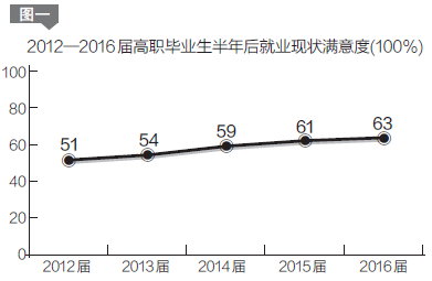 2016届高职毕业生毕业半年后平均月收入3599元,连续5年稳定增长,与2012届相比,提高了31.8%。毕业生就业满意度连续提升,2016届毕业生就业满意度达63%,比2012届提升了12个百分点。在大学生就业面临挑战的形势下,高职就业现状满意度持续上升实属不易(见图一)。